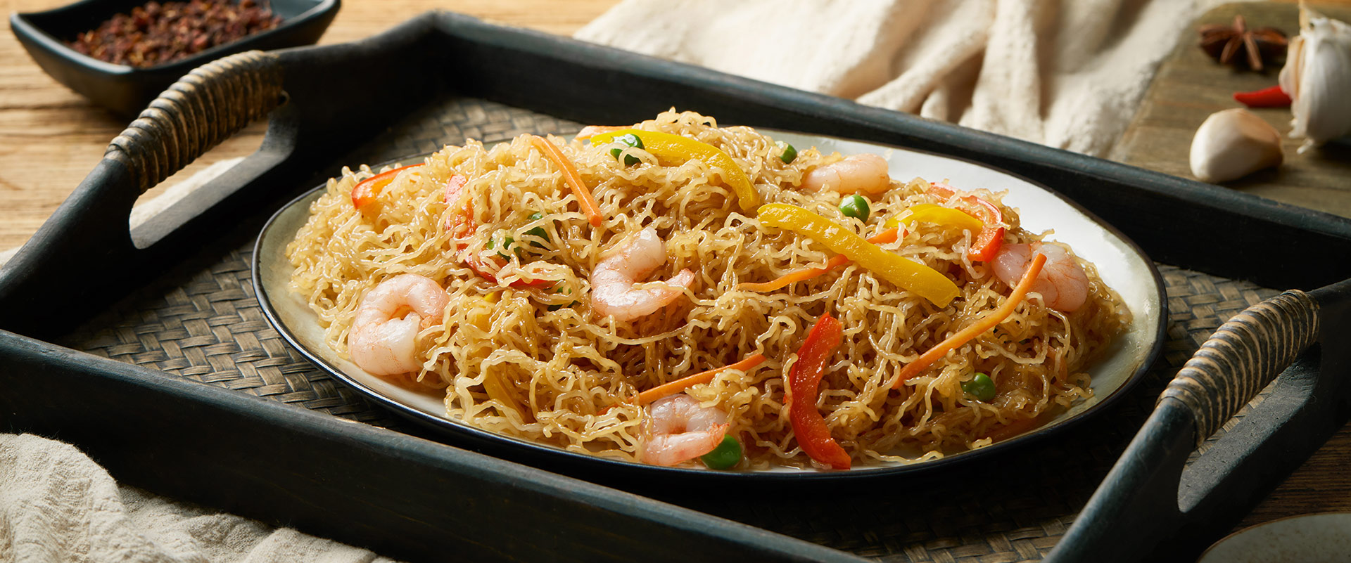 冷水浸泡米粉5-10分鐘后撈出,瀝干放置20-40分鐘使其自然軟化,炒之前將米粉放入冷水抓散后瀝干,即可下鍋,加入配菜,炒熟后即可食用。(炒米粉泡發小口訣:一泡二放三搓開)