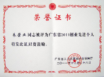 我集團執行總裁朱榮業先生等廣東省內100名創業先進個人榮獲“廣東省2011創業先進個人”榮譽稱號。
